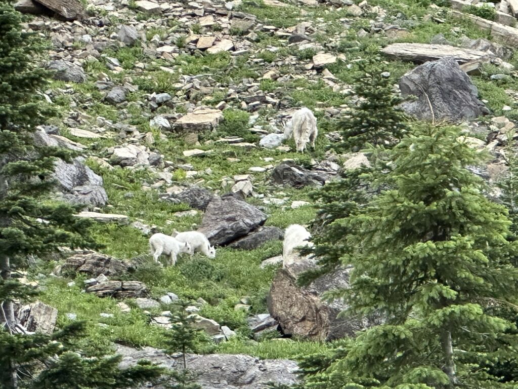 During the summer visit for another 5 days, we saw many mountain goats up close, including two young mountain goats, near the Going to the Sun Road on the Oberlin bend curve just before you turn into the Logan Pass parking lot if coming from the West Entrance of Glacier National Park. We also saw multiple Bighorn sheep right along the Highline Trail, and we later saw a big male grizzly bear relatively close by. We were able to avoid direct contact with the grizzly bear as he briefly walked along the Highline Trail. He was initially heading towards us on the trail, in order to cross a waterfall, before he headed up the mountain side where we then continued forward and observed him safely.