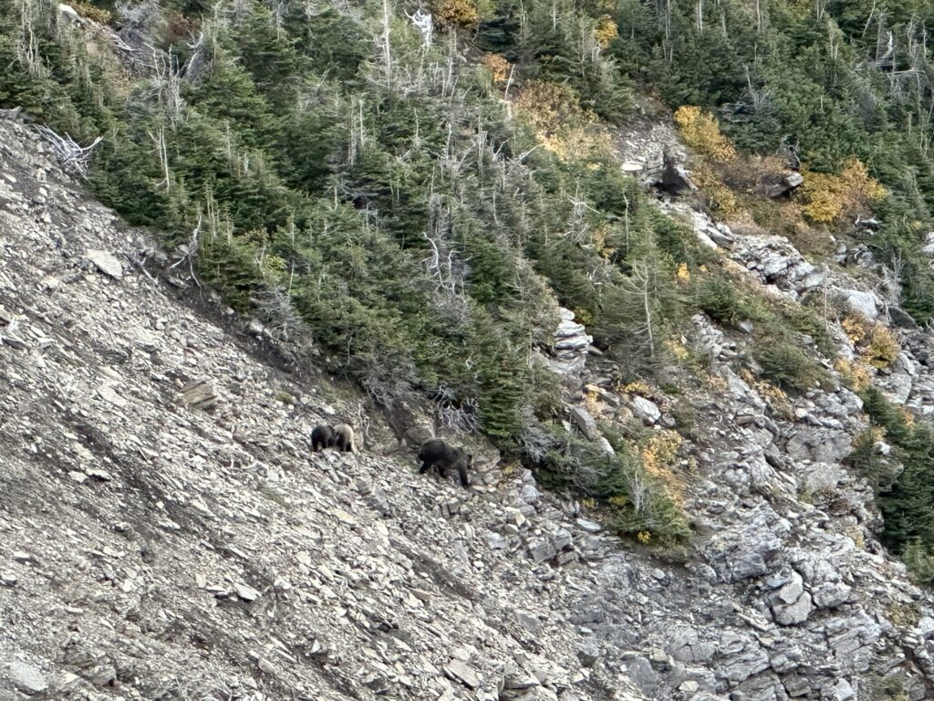 When we were at Glacier for 5 days in the fall, we saw a mother Grizzly Bear and her two cubs climbing along the mountainside in the near distance not too far from the Highline Trail, bighorn sheep in the distant mountains at the Hidden Lake overlook spot, two moose in nearby in the water of Lake Josephine and mountain goats way up in the distance in the mountains as we walked to Grinnell Lake in the Many Glacier area, and a black bear near the St. Mary Campground.